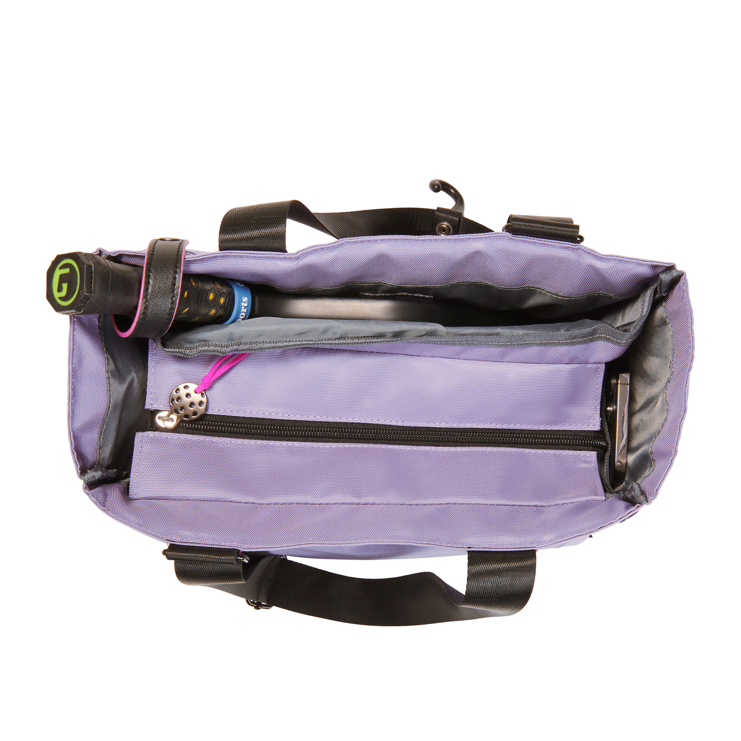 - The front pocket, with its zippered cover, holds all the accessories you will need on court—towels, jacket, sunscreen, hats, gloves, and extra balls.